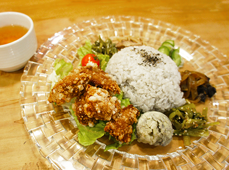 ・野生鹿肉のからあげ ¥1,980丹波篠山の猟師さんから一頭買いした山の恵みそのものの野生の鹿肉をやわらかく、臭みなく揚げたからあげと季節のオーガニック野菜を使ったいろいろな種類の副菜、麻炭ごはんがのったプレート(スープ付)。